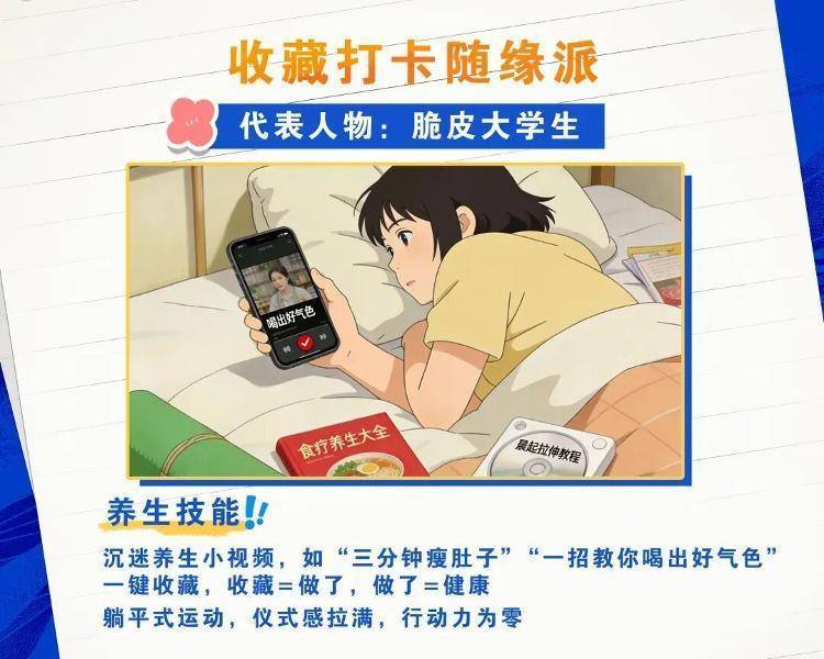 以年轻学生群体为主,手机收藏夹里塞满了“三分钟瘦肚子”“一招养出好气色”的养生短视频,仪式感拉满,行动力却为零。