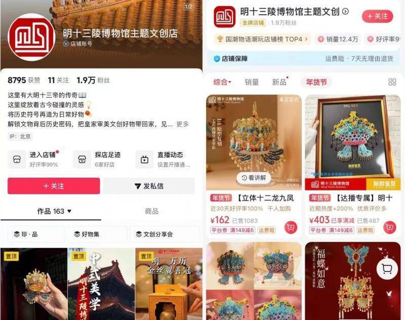 r2025年初,“明十三陵博物馆主题文创店”在抖音电商平台上线,胡永和带领的凤冠文创团队开始探索直播销售这条路。他们在网上发布十二龙九凤冠的文创冰箱贴后,还有人评论说“美到想去看看实物”。
