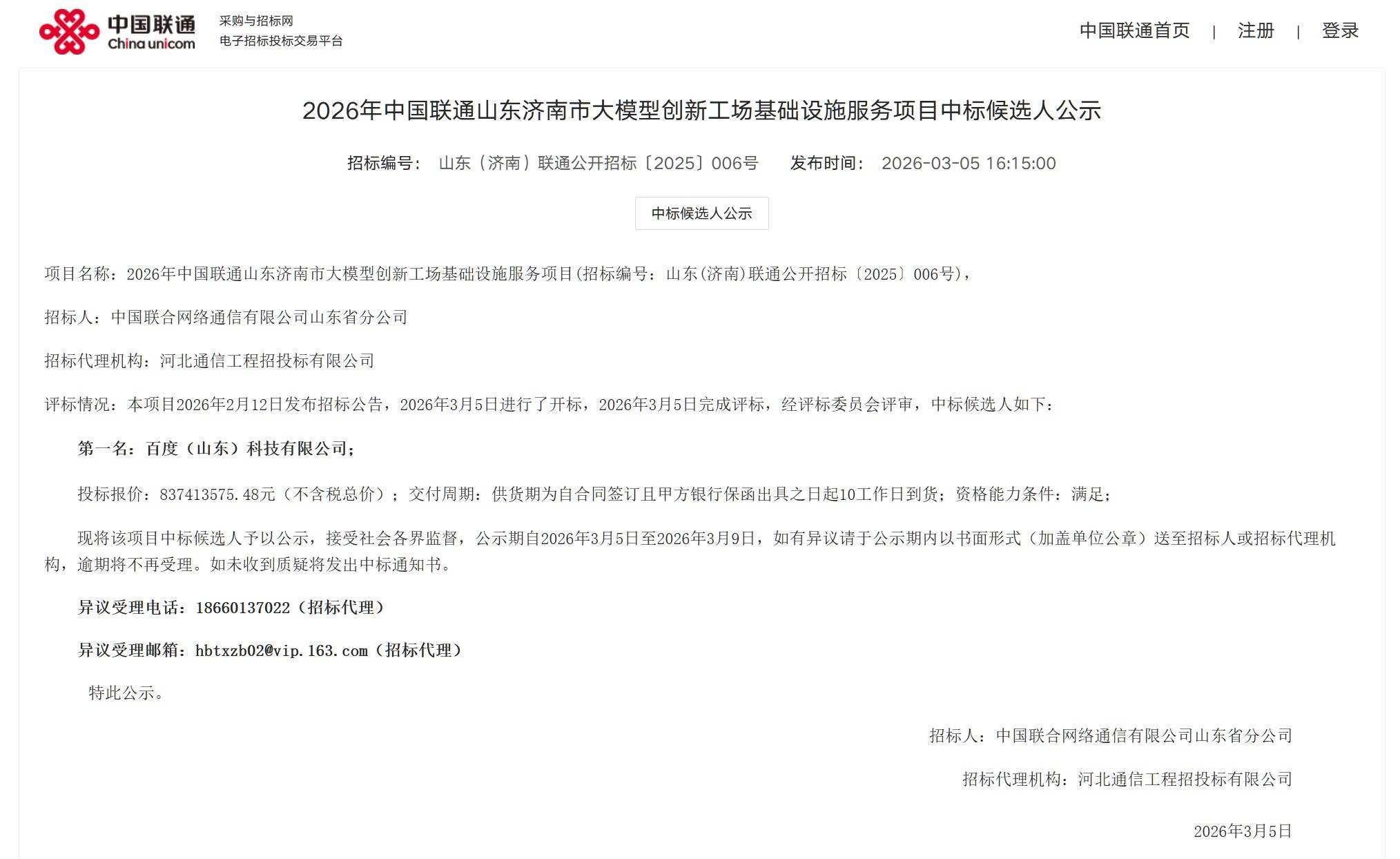 智东西3月6日消息,昨天下午,中国联通发布2026年山东济南市大模型创新工场基础设施服务项目中标公告,百度中标,金额为8.37亿元。
