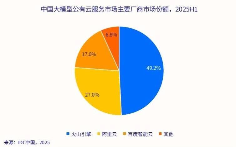 根据行研机构IDC数据,2025年上半年,在中国大模型公有云服务市场中,百度智能云市场份额17%,位列第三,在火山引擎(49.2%)、阿里云(27%)之后。