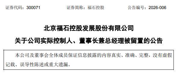 2月1日晚间炒股配资平台查询,福石控股(300071)1日公告称,近日收到国家某监察委员会签发的留置通知书,公司实际控制人、董事长兼总经理陈永亮先生被实施留置。