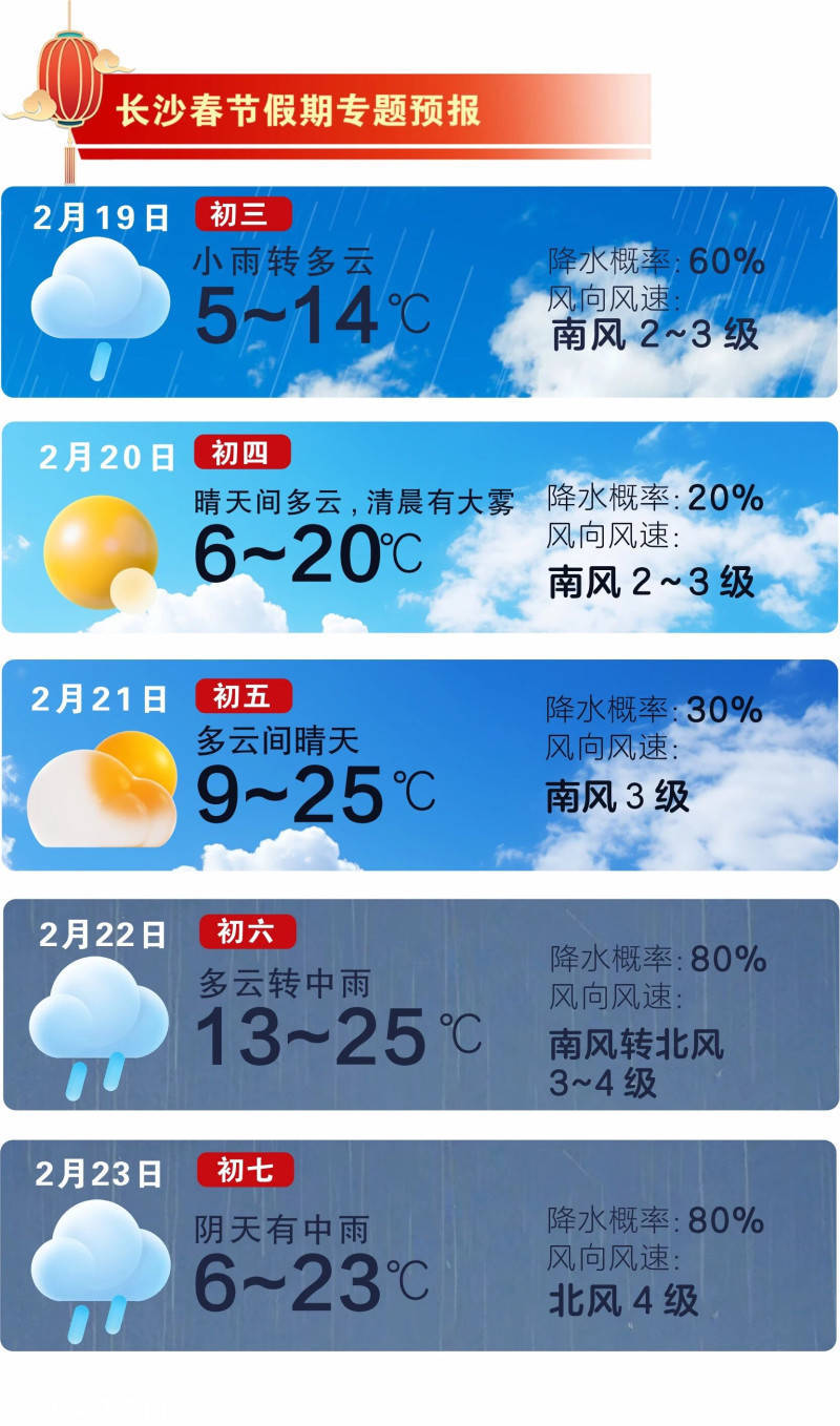 据长沙市气象台预计,一直到21日(初五),长沙受偏北气流控制,以多云天气为主,部分时段有小雨,气温稳步攀升。其中,19日(初三)小雨转多云,气温5℃至14℃,雨水暂歇,暖意渐显;20日(初四)晴天间多云,清晨有大雾,气温6℃至20℃,晴好天气“上线”,适合亲友相聚出游;21日(初五)多云间晴天,最高气温将冲刺25℃,暖意十足。这样舒适的天气,正是走出家门的好时机,无论是走亲访友,还是趁着暖意去岳麓山、洋湖湿地公园踏青赏景,都能在暖阳中收获满满的新春喜悦。