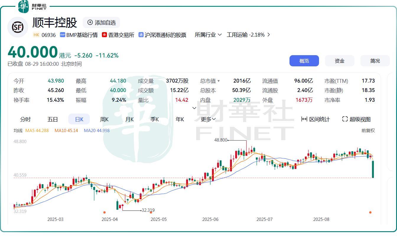 8月29日,截至收盘,顺丰控股H股大幅下挫11.62%,报40港元/股;A股同样走弱,跌幅为7.91%,报44.57元/股。