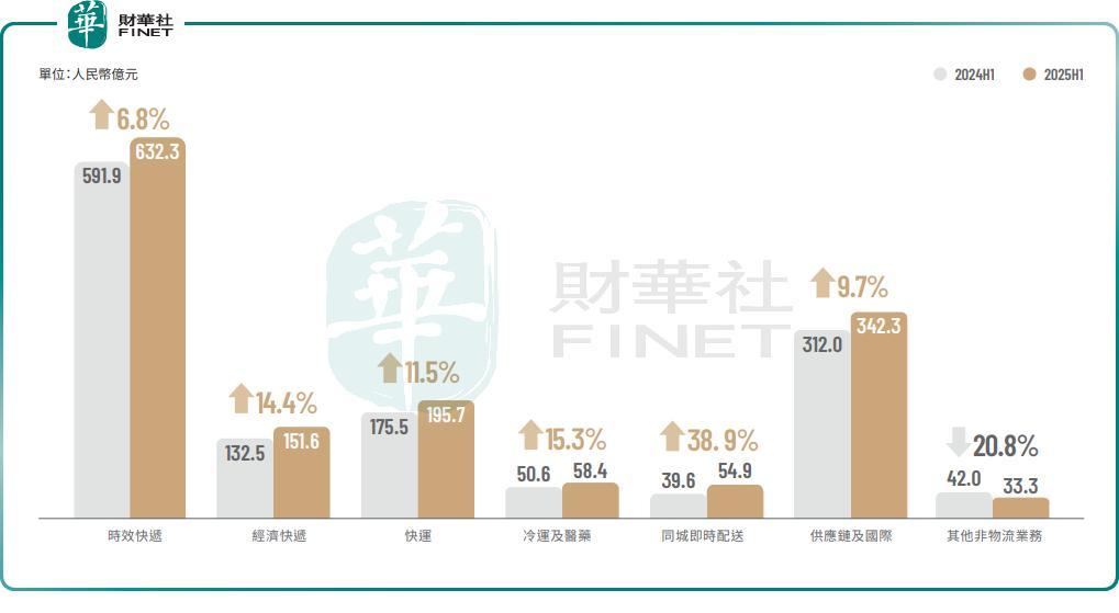 按经营分部划分,2025年上半年,顺丰的核心业务板块——速运及大件分部收入1047.7亿元,同比增长8.21%,占比为71.34%;净利润约53.8亿元,同比增长12.28%。