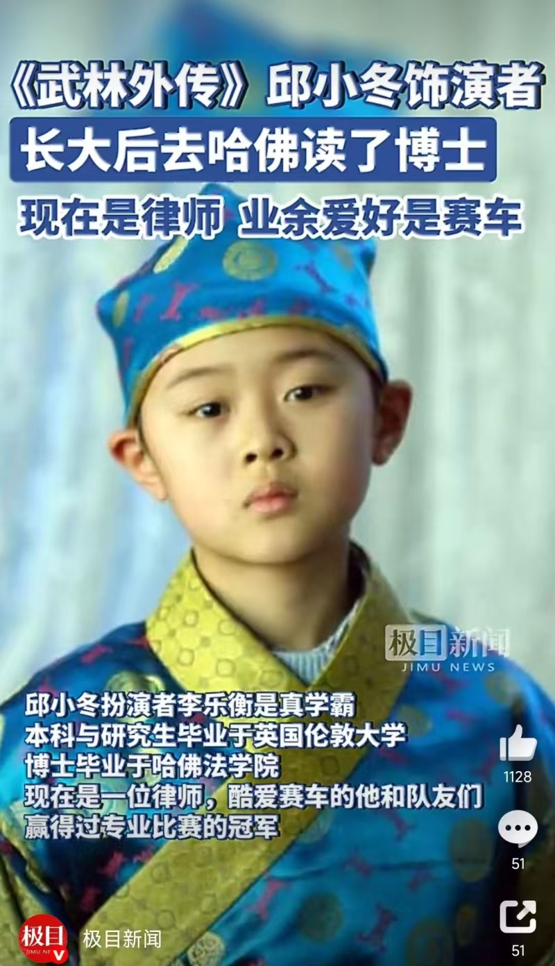 剧中七侠镇“邱员外”12岁的儿子,莫小贝的同班同学“邱小冬”是白马书院的优等生。2024年,有媒体报道,“邱小冬”的饰演者李乐衡也像剧中一样,是“别人家的孩子”,酷爱赛车的他和队友们赢得过专业比赛的冠军,在伦敦大学学习了机械工程专业,后来去哈佛攻读了法律博士。还有消息称,他毕业之后在知名律师事务所成为一名律师。