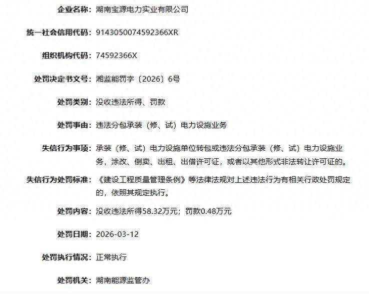 近日,国家能源局资质和信用信息系统处罚信息显示,湖南宝源电力实业有限公司低息配资因违法分包承装(修、试)电力设施业务,被湖南能源监管办没收违法所得58.32万元并罚款0.48万元。